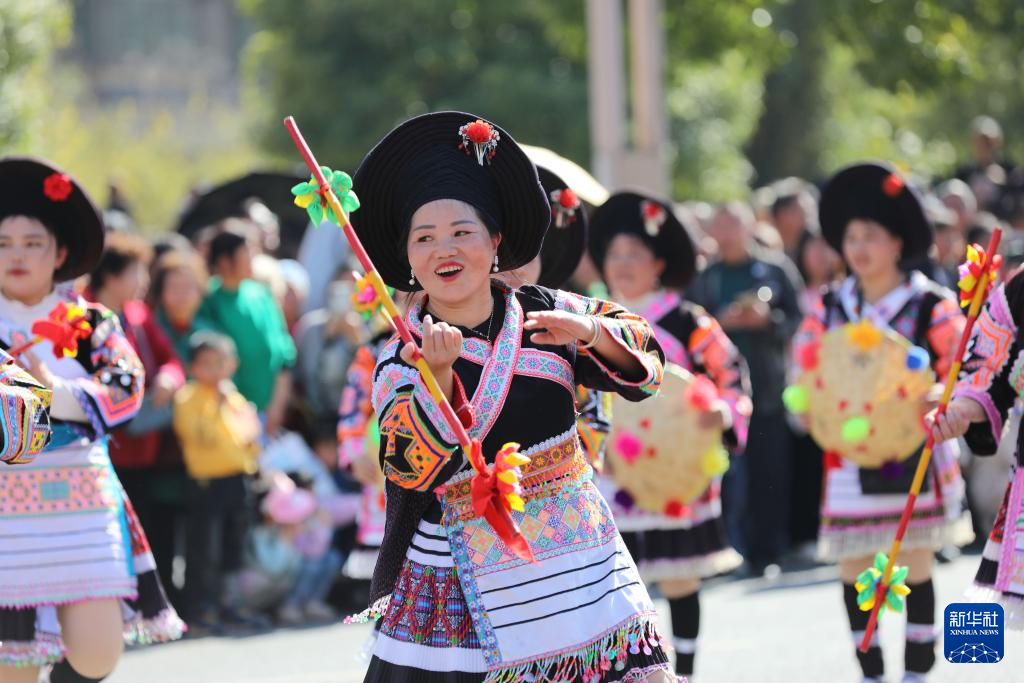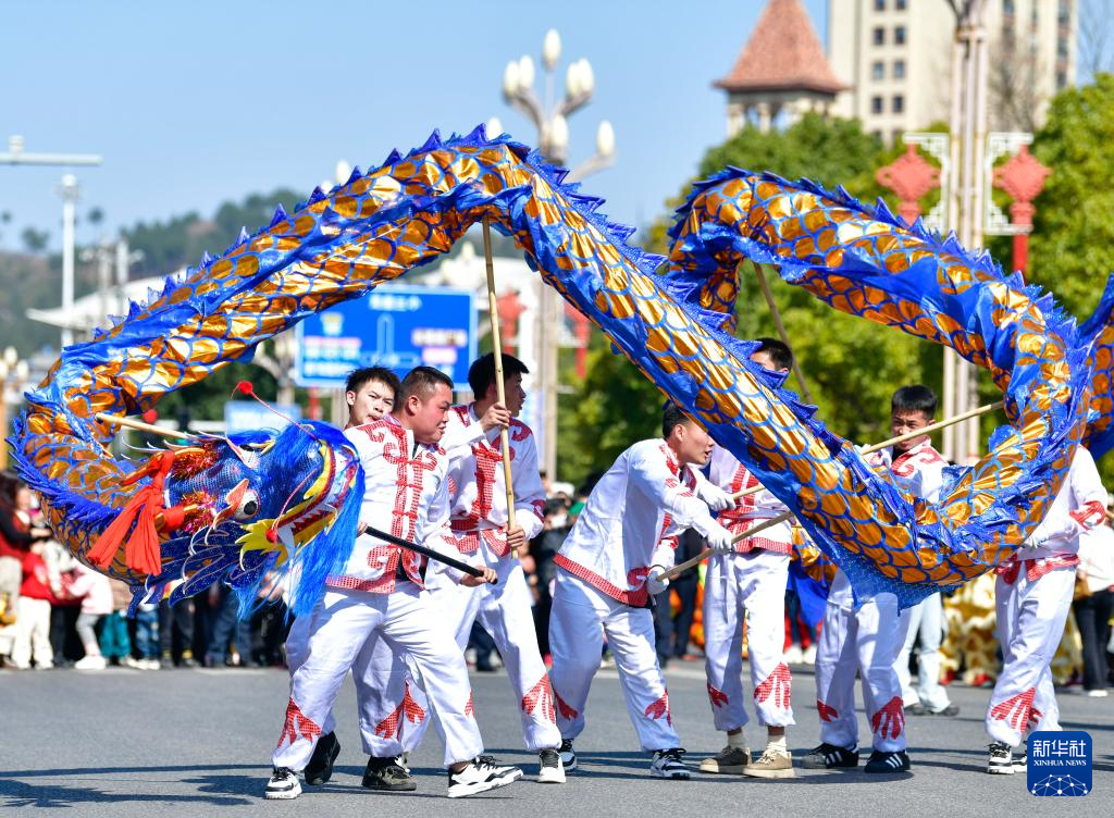 当日是正月初九,贵州省黔南布依族苗族自治州龙里县举办主题为“金龙贺岁·欢欢喜喜过龙年”的民俗踩街活动。