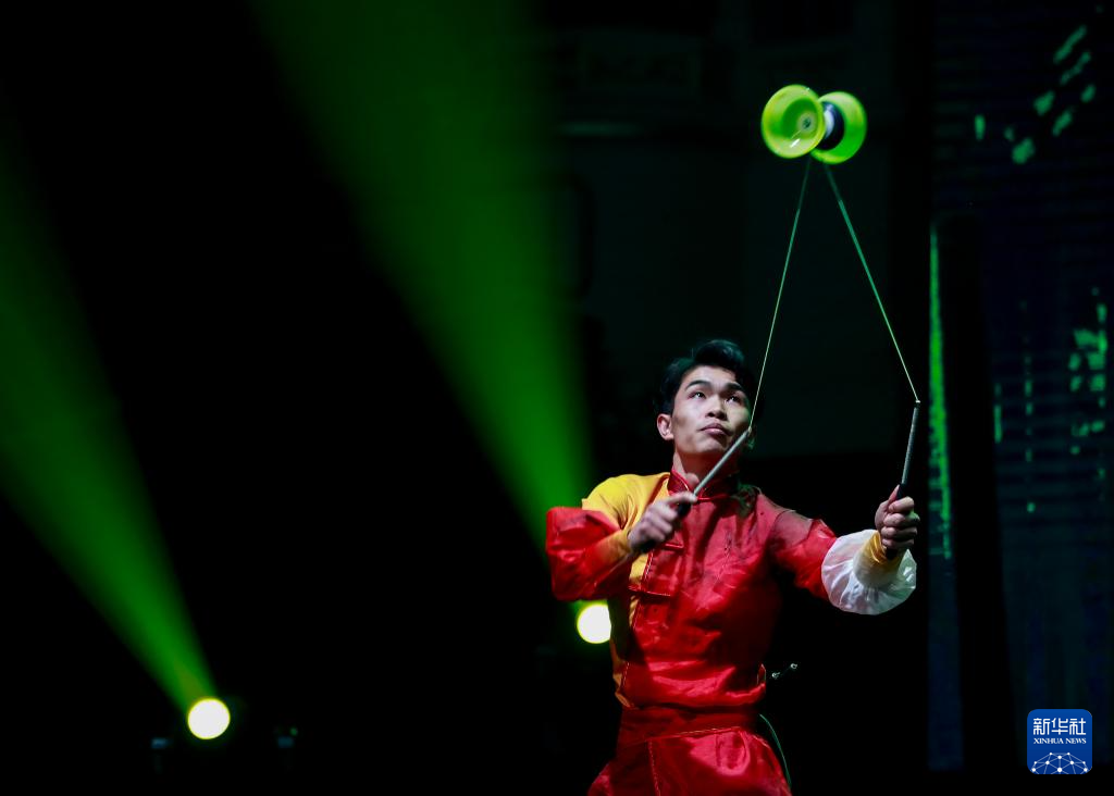 2月21日,演员延翔宇在澳大利亚悉尼“四海同春”访演活动上表演杂技《十面埋伏》。