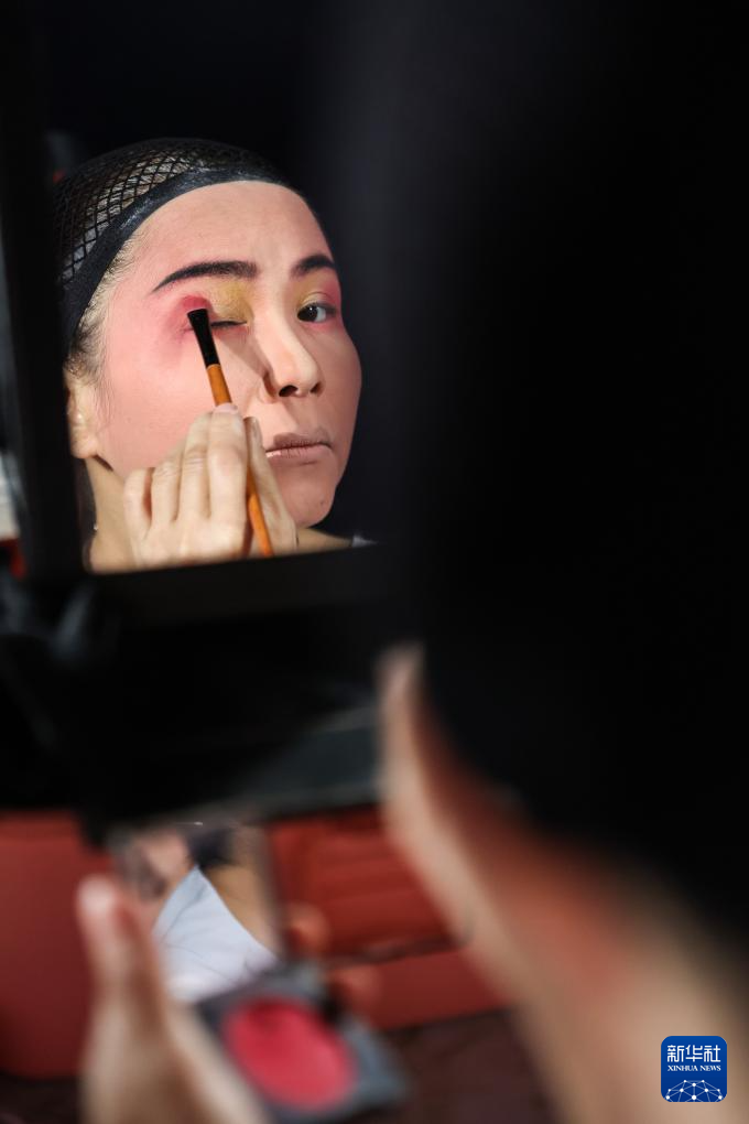 2月21日,海南定安县琼剧团的演员们在定安县后山村演出前化妆。