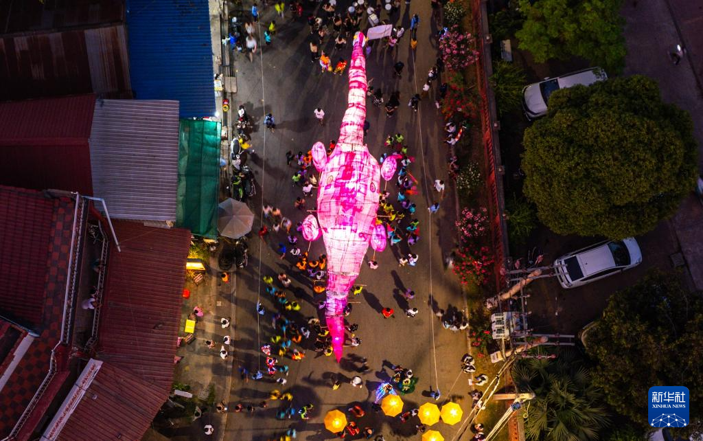 这是2月24日在柬埔寨西北部暹粒市拍摄的主题为恐龙的巨型彩灯装置游行(无人机照片)。