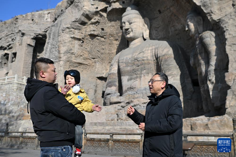 杭侃(右二)在云冈石窟调研走访,了解游客的需求(2月25日摄)。