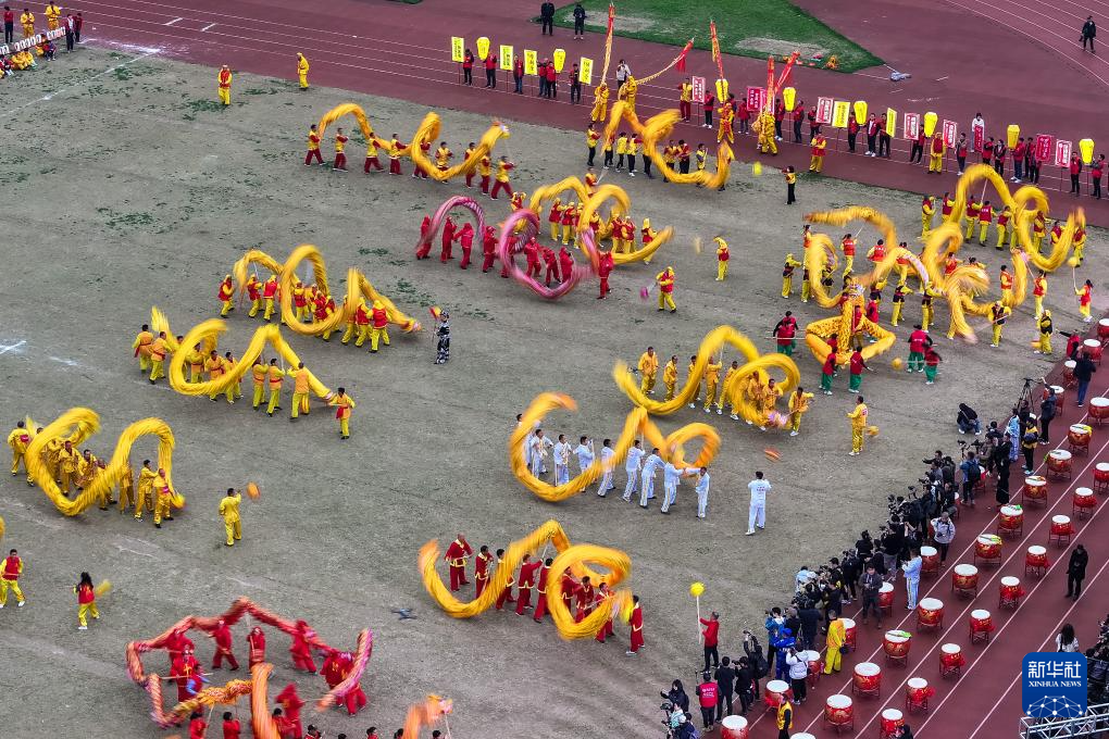 3月16日,民间演员在慈利县人民广场表演舞龙(无人机照片)。