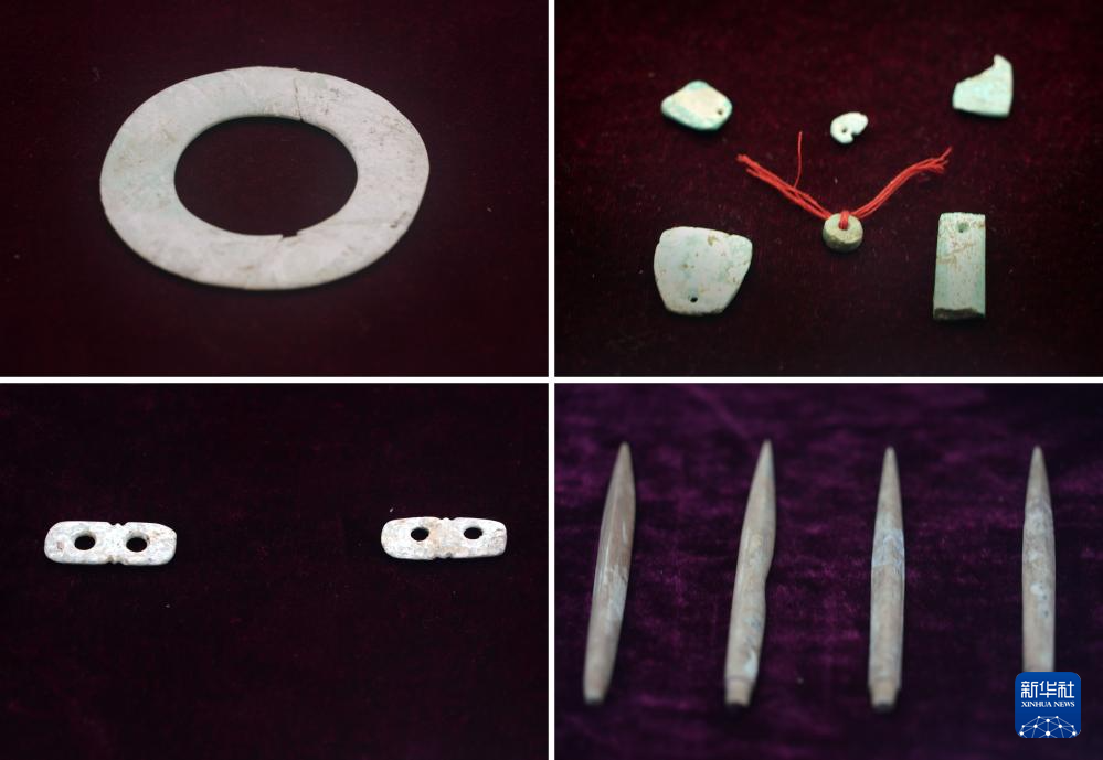 这是王庄遗址出土的玉瑗(左上)、绿松石坠饰(右上)、双联玉璧(左下)、骨锥(拼版照片,1月30日摄)。