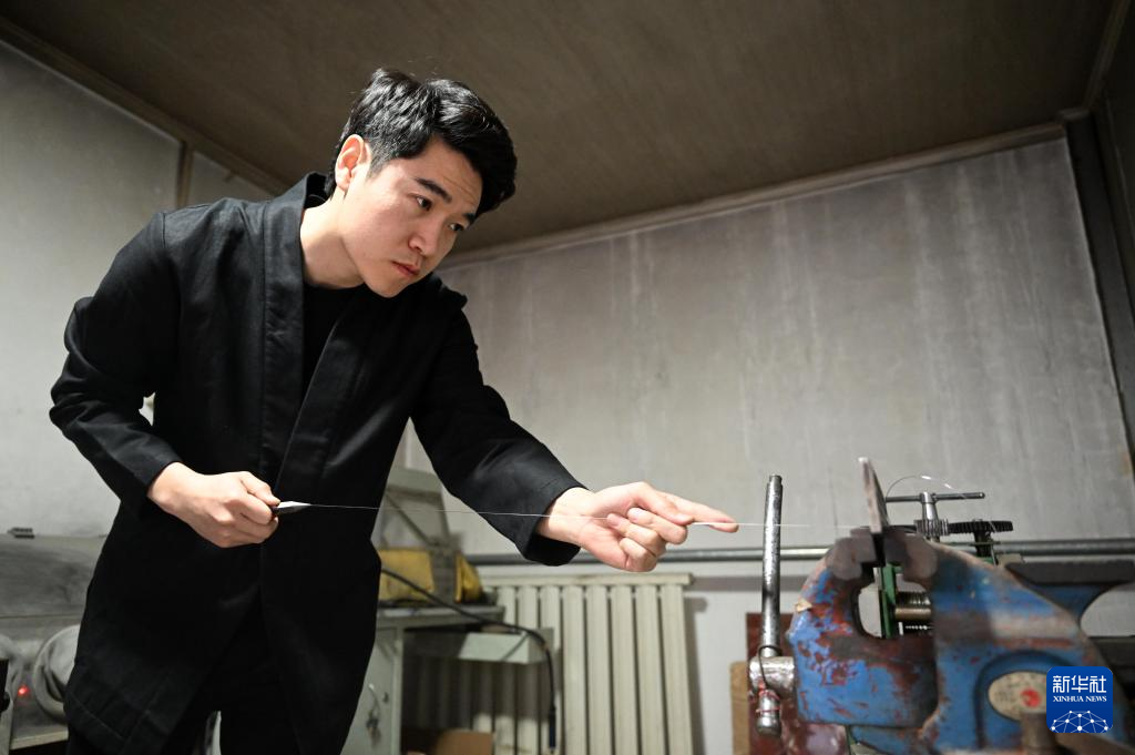 3月19日,马赛在工作室内进行手工拉丝。