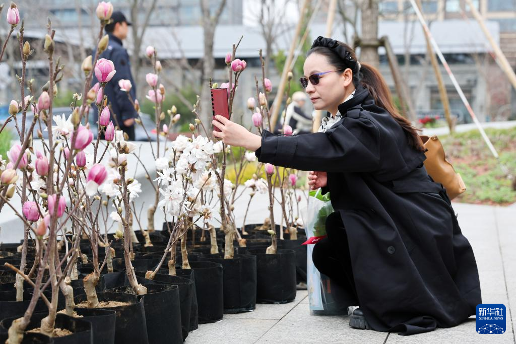 3月26日,市民在现场拍摄展出的白玉兰盆栽。