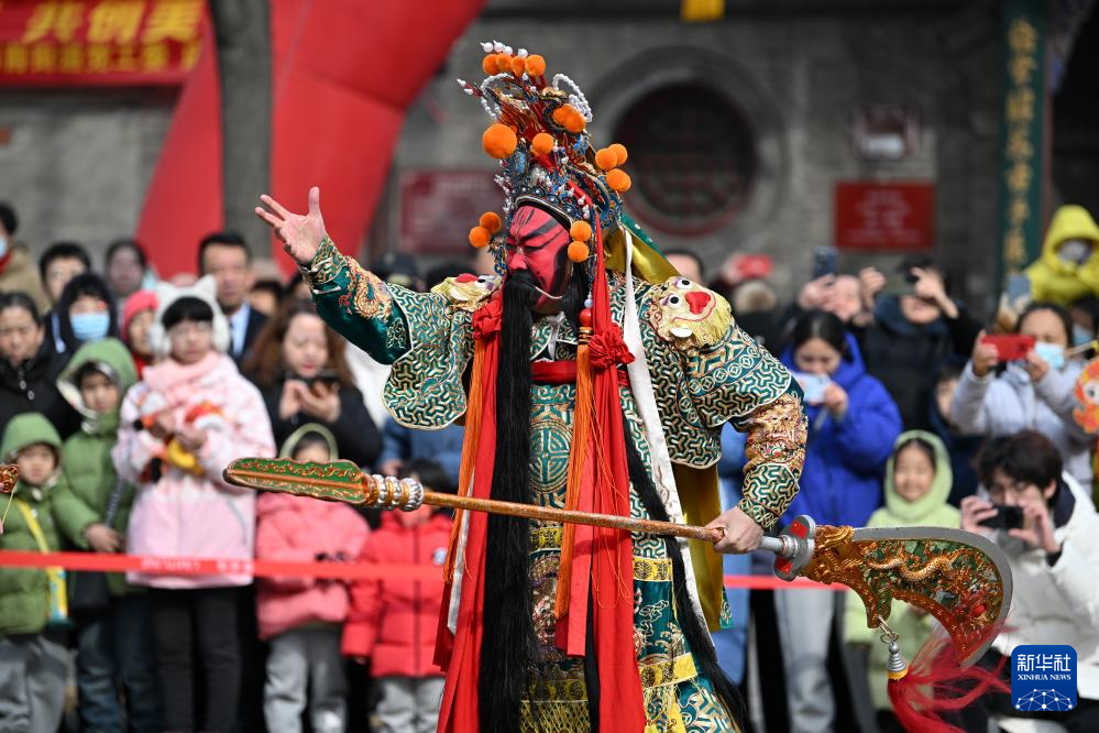 在太原市迎泽区庙前街,扮演关公的武凌云在文化展演活动上表演(2月23日摄)。