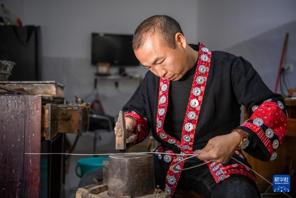 4月8日,手艺人在贵州省黄平县谷陇镇一家银饰店内制作银饰。
