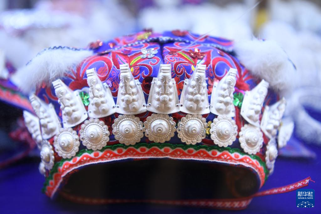 4月8日,在贵州省黄平县,国家级非遗项目苗族银饰制作技艺的代表性传承人杨正贵在自己的工作室中整理一件银帽。