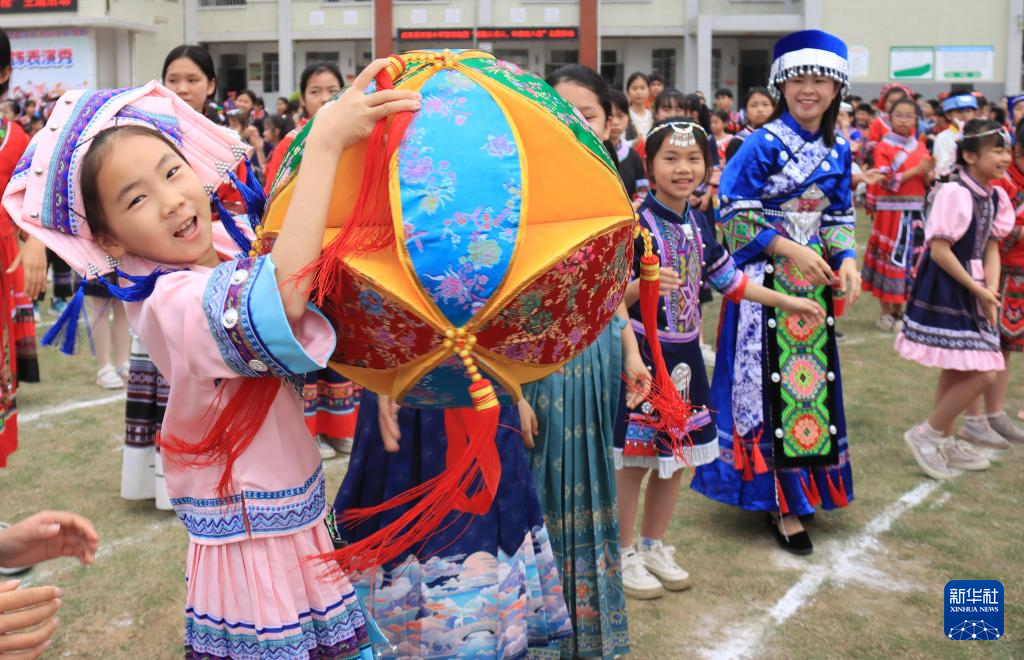 4月8日,在广西柳州市融水苗族自治县融水镇苗家小镇小学,师生载歌载舞(无人机照片)。