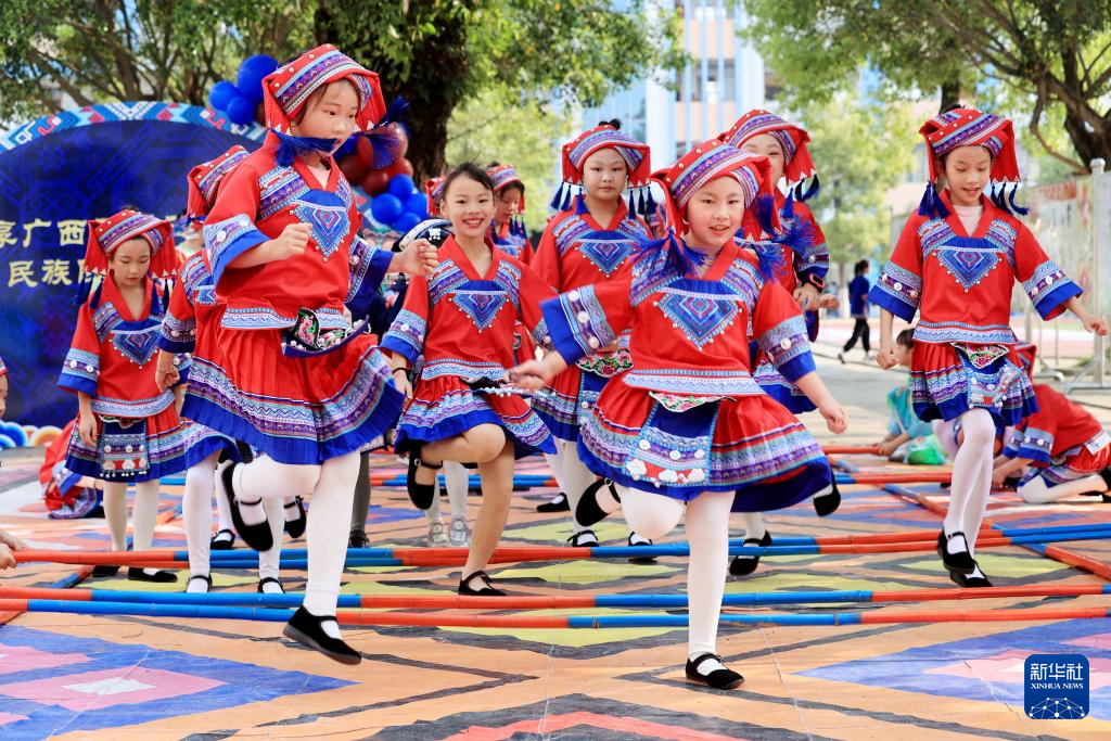 4月9日,在广西柳州市融安县实验小学,学生在跳竹竿舞。