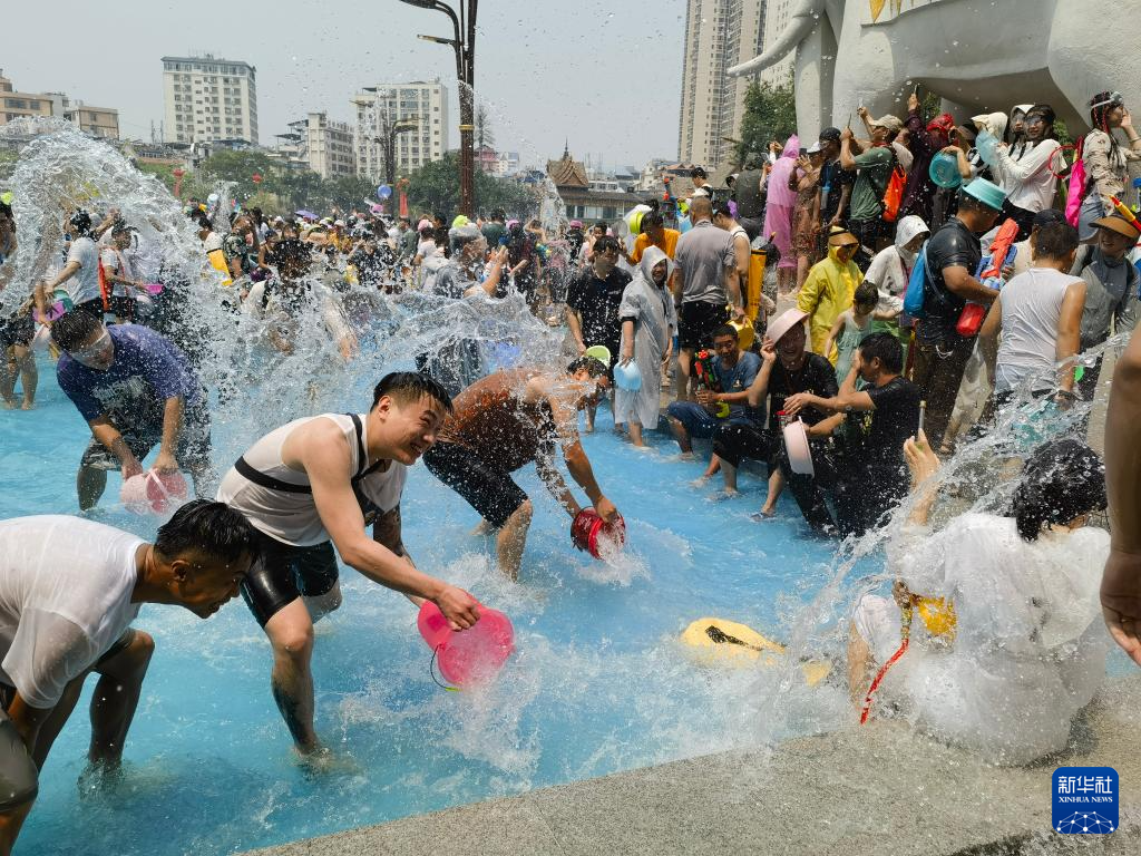 当日,云南省西双版纳傣族自治州举行泼水狂欢活动,人们欢聚在景洪市泼水广场,用相互泼水的方式互送祝福,庆祝泼水节。