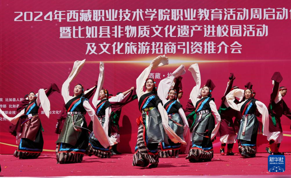 当日,西藏职业技术学院职业教育活动周在拉萨启动,那曲市比如县民族艺术团非物质文化遗产表演暨“乡村振兴 那曲奋进”旅游推介走进校园,激发人们对传统文化和特色旅游的兴趣。