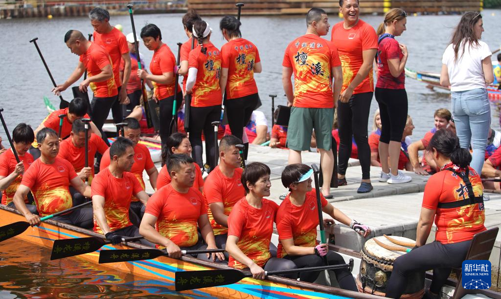 5月11日,在捷克首都布拉格举行的第27届布拉格龙舟节上,来自浙江省浦江县的龙舟队队员赛前热身。