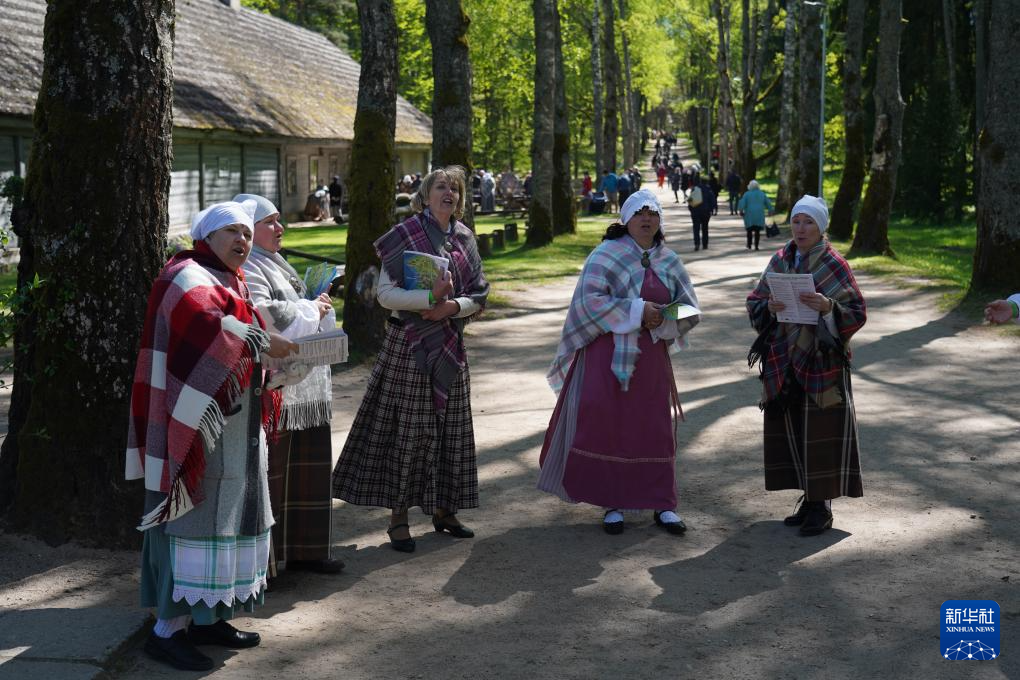 5月11日,在拉脱维亚里加市郊,人们在拉脱维亚民族志露天博物馆建馆百年庆祝活动上演唱拉脱维亚民歌。