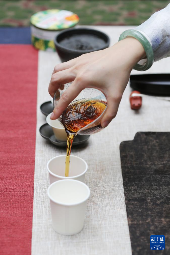 5月24日,茶艺师在比利时布鲁塞尔“茶和天下·雅集”云南茶文化交流活动上倒茶。