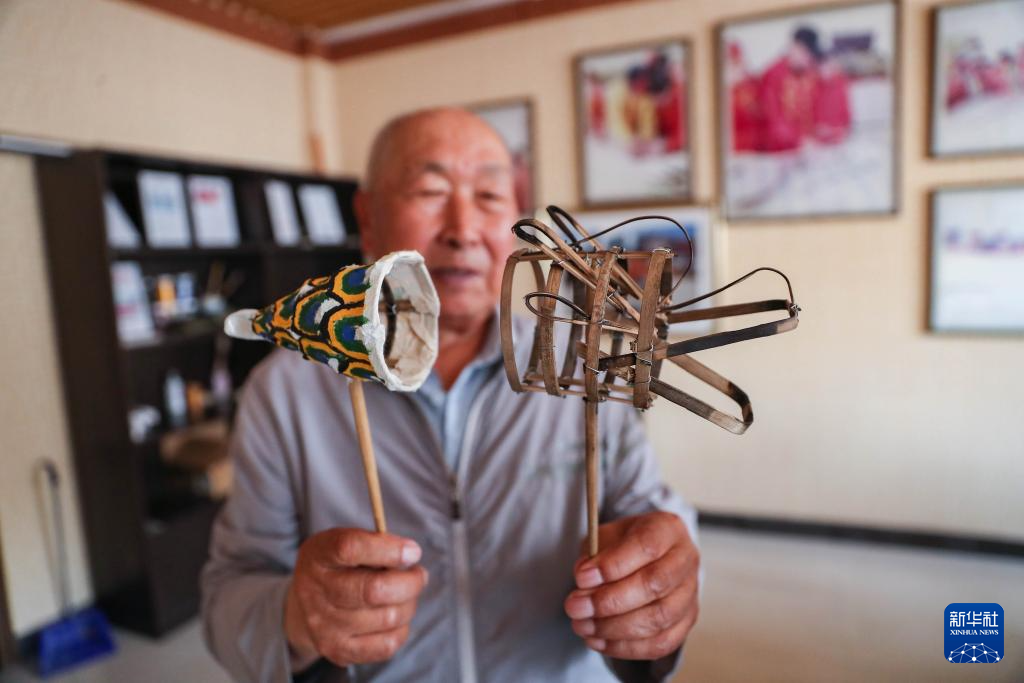 6月3日,张仲发在位于沈阳市沈北新区虎石台街道的非遗工作室中展示龙头。