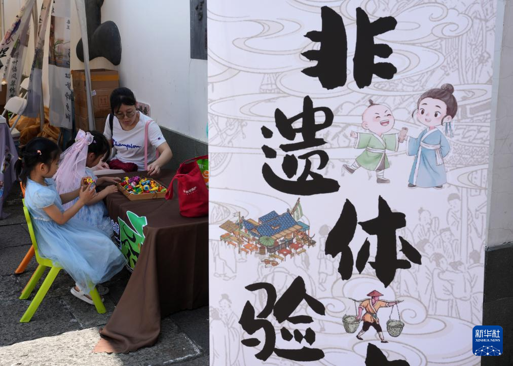 6月16日,小朋友在杭州桥西历史文化街区一处非遗体验点游玩。