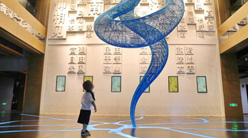 6月29日,小朋友在芦席汇历史街区“大运河数字诗路e站”观看“俯仰相见”雕塑。