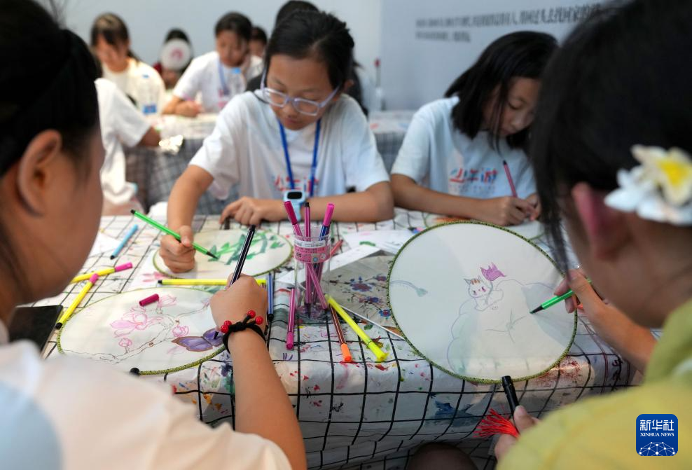 8月15日,孩子们在杭州手工艺活态馆内体验扇面绘画。