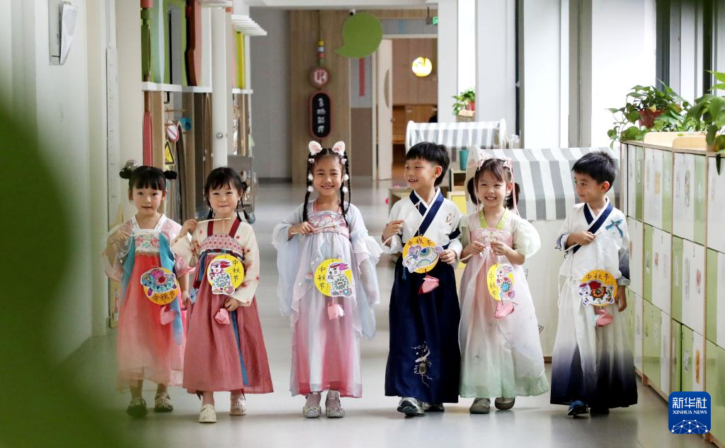 9月12日,在江苏省苏州市姑苏区平润实验幼儿园,小朋友手提自制的“玉兔望月”中秋饰品欢乐游园。