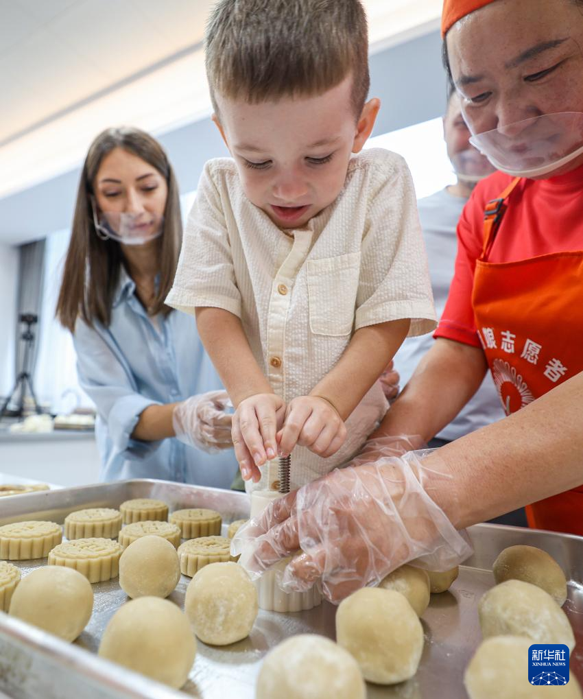 9月12日,在山东省荣成市新时代文明实践中心,外国友人体验制作月饼。