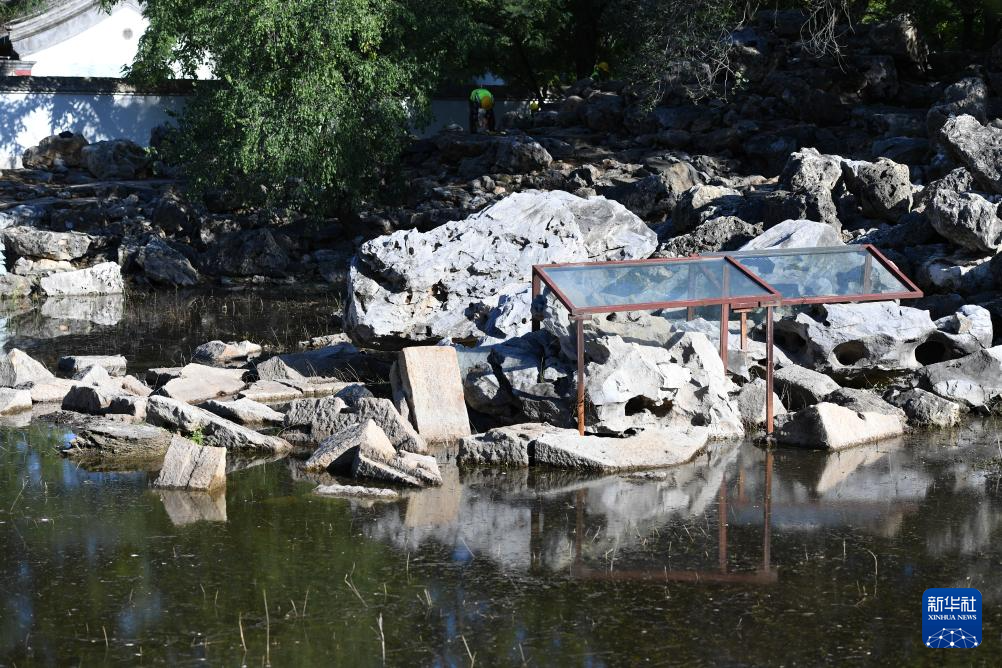 9月22日拍摄的文源阁遗址湖池中的“玲峰”石遗存。此石曾竖立于湖中,乾隆皇帝赐名“玲峰”。