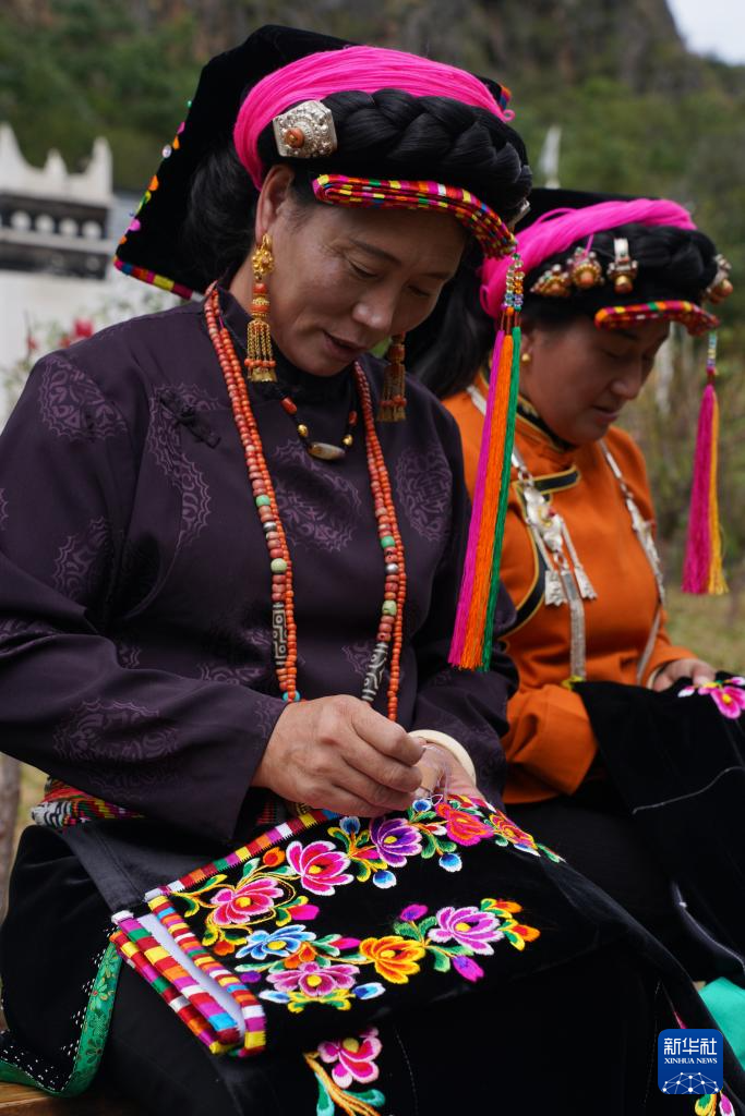 10月12日,嘉绒藏族刺绣甘孜州非遗传承人阿姆(左)和徒弟安初在四川省丹巴县巴底镇色足村绣花。