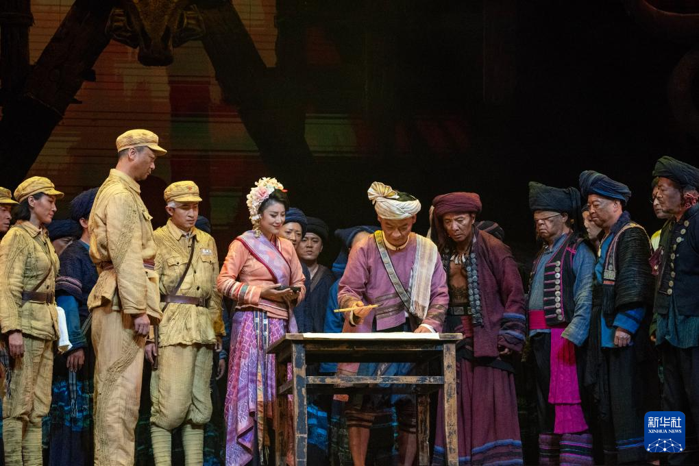 10月13日晚,演员在云南省大剧院表演话剧《澜沧水长》。