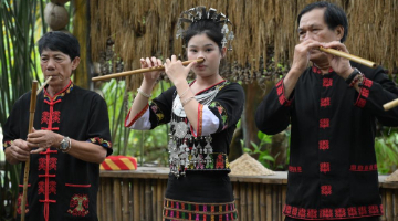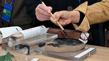 11月14日,茶艺师(中)在杭州秋季茶博会上举行的一场茶会中邀请来宾品茶。
