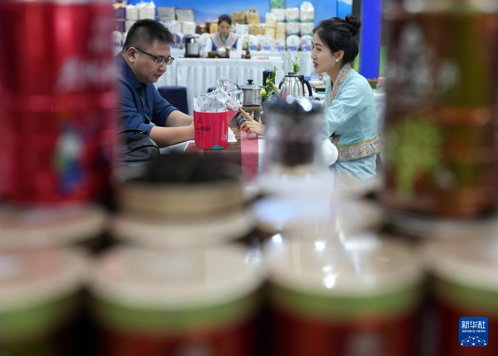 11月14日,人们在杭州秋季茶博会一家参展商展位上品茶。