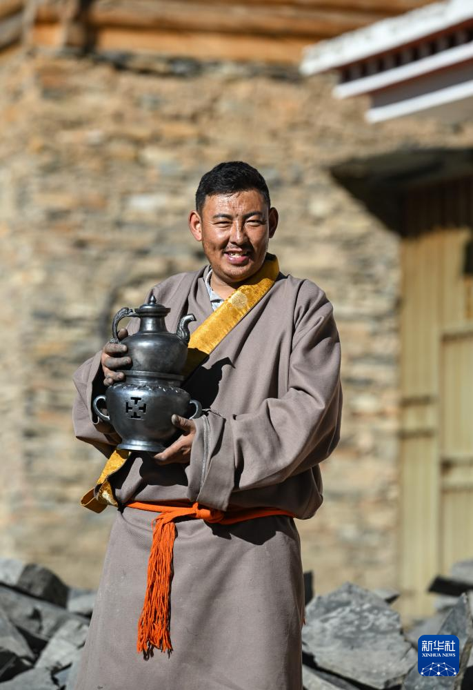 达瓦扎巴在展示“钦乐工坊”采用利玛铜铸造工艺制作的文创产品(11月3日摄)。达瓦扎巴1992年出生在四川省甘孜藏族自治州德格县麦宿镇一个手工艺家庭,其家族有约两百年制作利玛铜铸制品的历史。达瓦扎巴从小跟随父亲尼玛学习。如今,他已是非遗项目“藏族金属锻造技艺”四川省甘孜州代表性传承人。达瓦扎巴在继承传统工艺的同时,开发创作时尚文创产品,将藏族传统手工艺推向国际市场。目前,其家族的“钦乐工坊”有全职手艺人约40名。