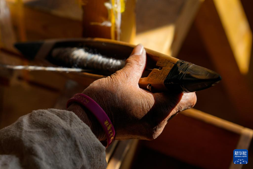 占珠在娜叶编织工坊使用老式织机制作氆氇(11月3日摄)。在四川省甘孜藏族自治州德格县麦宿镇,娜叶家族中的女性以精湛的编织技艺著称。她们利用牦牛绒、羊绒等物编织出优质的氆氇等纺织品,深受当地居民喜爱。占珠于1960年出生于麦宿,是娜叶家族编织工艺的继承者和发扬者,是非遗项目“藏族牛羊毛编织技艺”四川省甘孜州代表性传承人。在女儿扎西曲措的帮助下,娜叶编织工坊的产品日益丰富,在传承家族古老技艺的同时,带动周边乡亲共同致富。