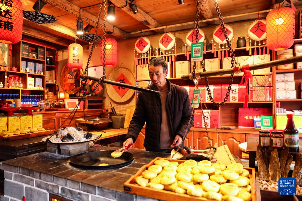 11月18日,在甘肃省陇南市宕昌县哈达铺镇上街村,村民在哈达铺红军街上的传统民居铺面内烘烤点心。