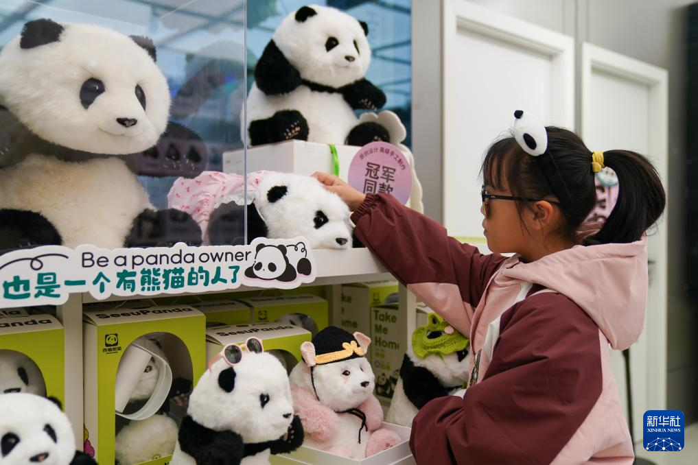 11月21日,在成都市一家熊猫文创商品店内,小朋友选购高仿真大熊猫玩偶。