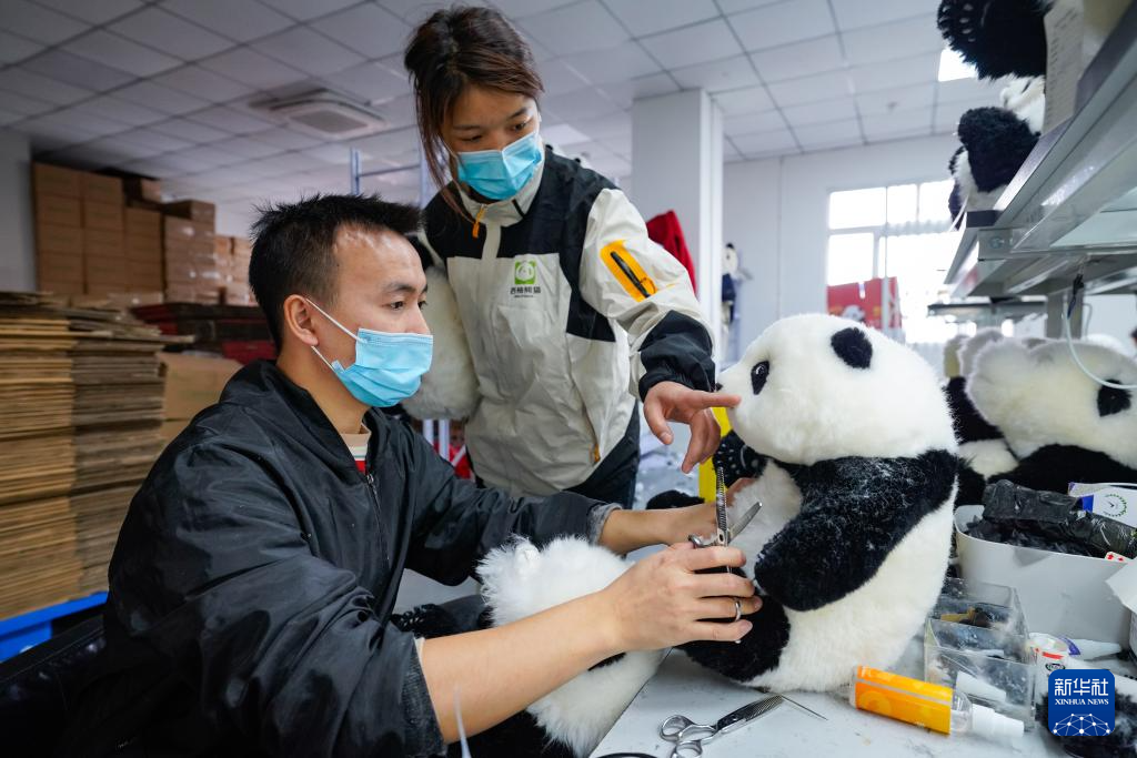 在位于四川省成都市的“西柚熊猫”生产车间,一名造型师在对高仿真大熊猫玩偶进行精修(11月21日摄)。