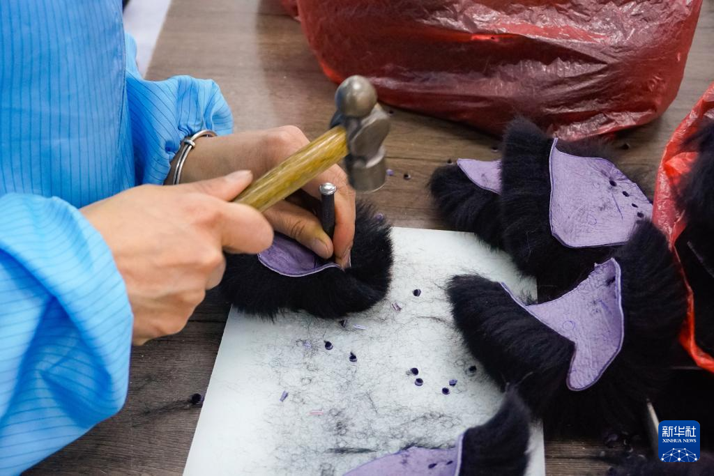 在位于四川省成都市的“西柚熊猫”生产车间,工人剪裁用于制作高仿真大熊猫玩偶部件的羊皮(11月21日摄)。