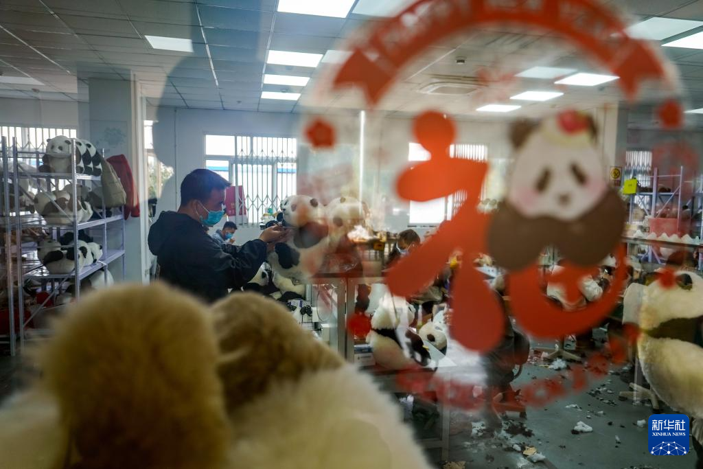 在位于四川省成都市的“西柚熊猫”生产车间,工人在安装高仿真大熊猫玩偶的“腿”(11月21日摄)。
