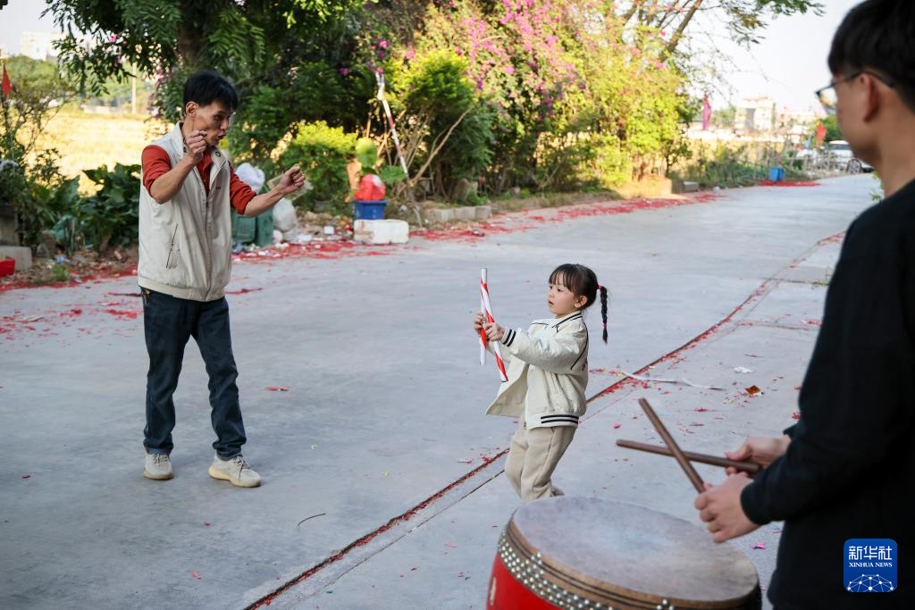 12月9日,广东省汕头市潮阳区贵屿镇玉窖村举办民俗活动,5岁女童庄恩琪手持英歌槌,跟随鼓点节奏与当地的英歌队员一同起舞,动作有力且充满韵律,赢得了在场观众阵阵掌声。