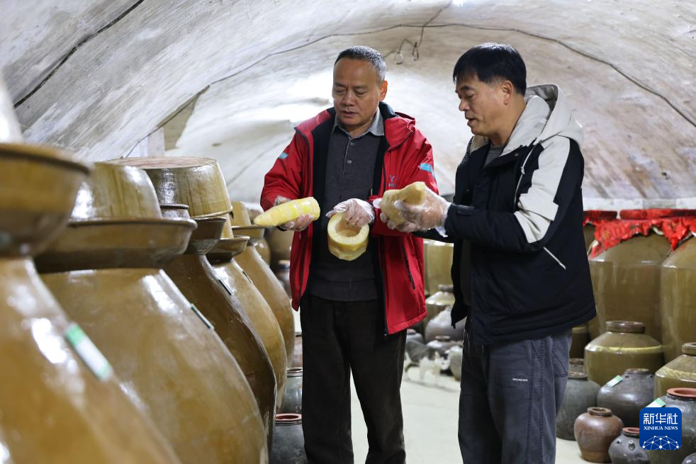 12月13日,柳州螺蛳粉制作技艺非遗传承人陈伟(右)在一家老酸水菌种库查看酸笋发酵情况。