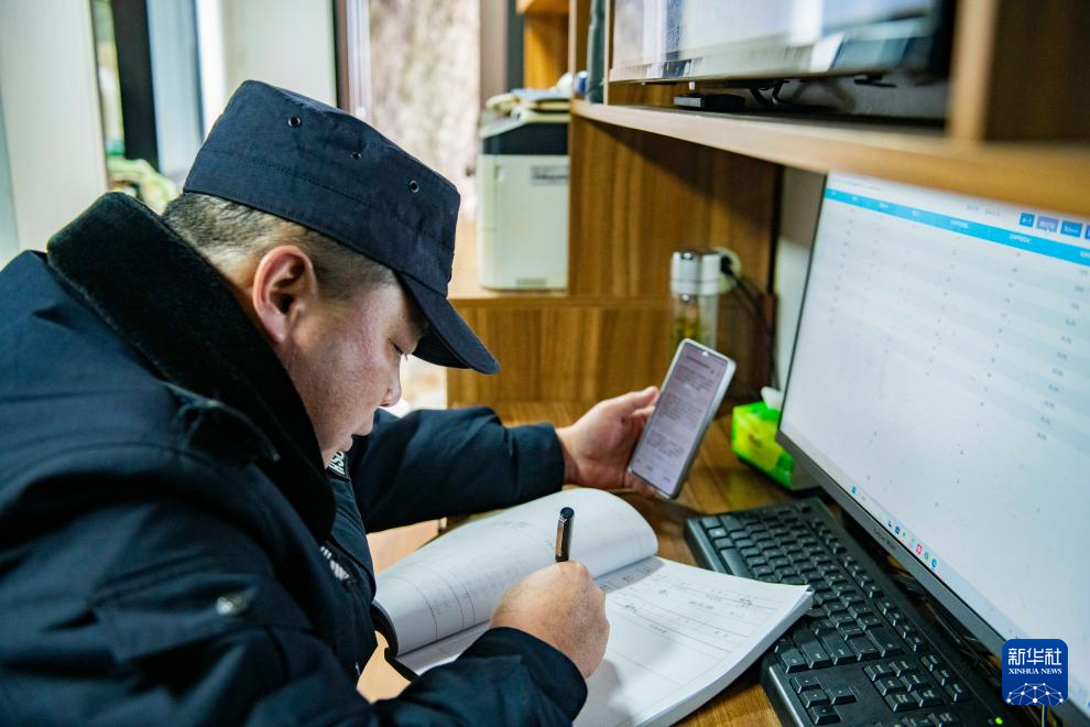 12月18日,在迎客松旁的值班室里,“守松人”胡晓春将巡查情况记录到《迎客松日记》中。