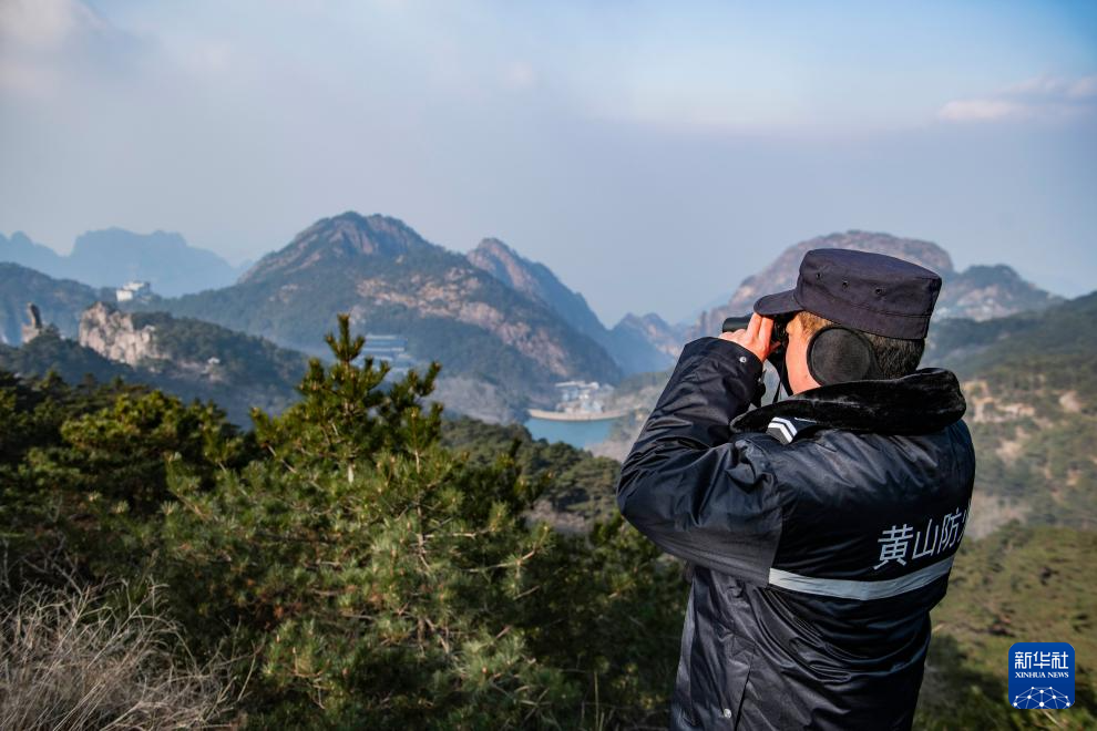 12月18日,黄山风景区管委会园林局瞭望哨防火小队队长秦志平在平天矼瞭望哨外用望远镜观察远处情况。
