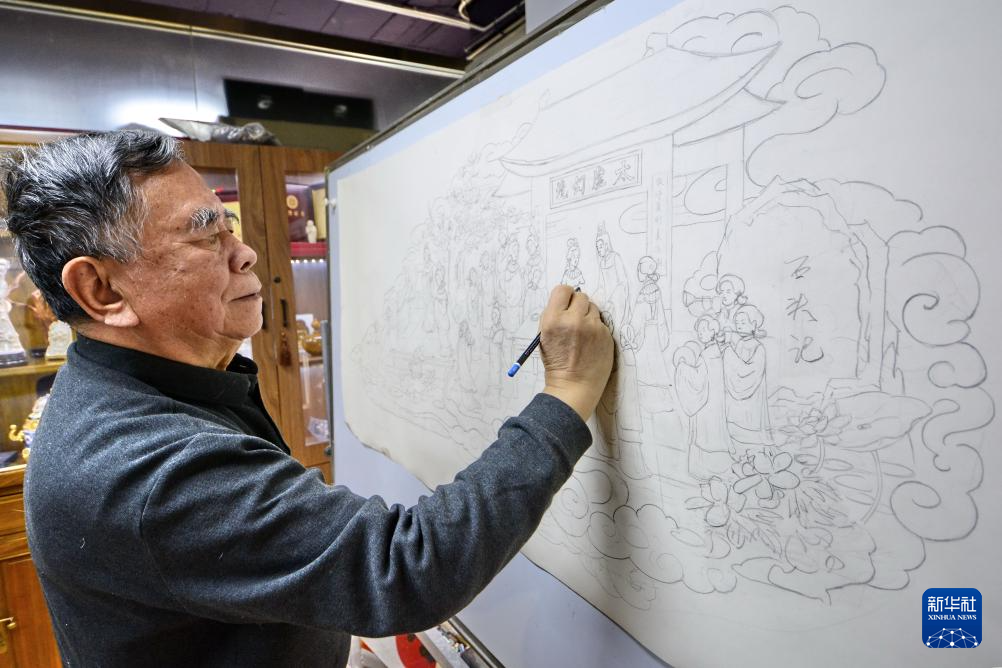 李春珂在他的牙雕工作室内设计大型牙雕作品(12月17日摄)。