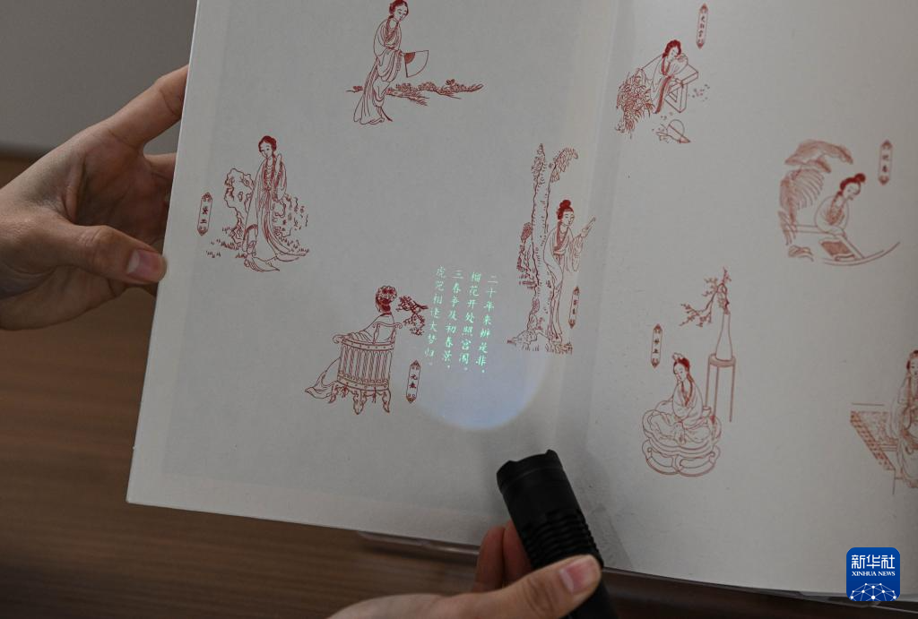 12月29日,工作人员在位于海口的山海轩文创空间展示《红楼忆梦手账》在紫光灯照射下显现的金陵十二钗判词。