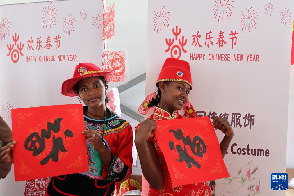 1月12日,在埃塞俄比亚首都亚的斯亚贝巴友谊广场,当地市民在“庆祝中埃塞建交55周年暨欢乐春节活动”现场试穿中国传统服装并拍照留念。