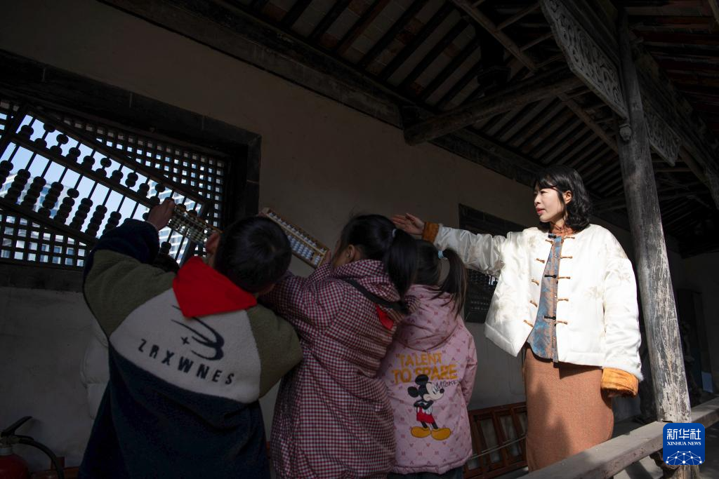 1月9日,在位于安徽省黄山市屯溪区的程大位故居,汪素秋为学生讲解珠算知识。