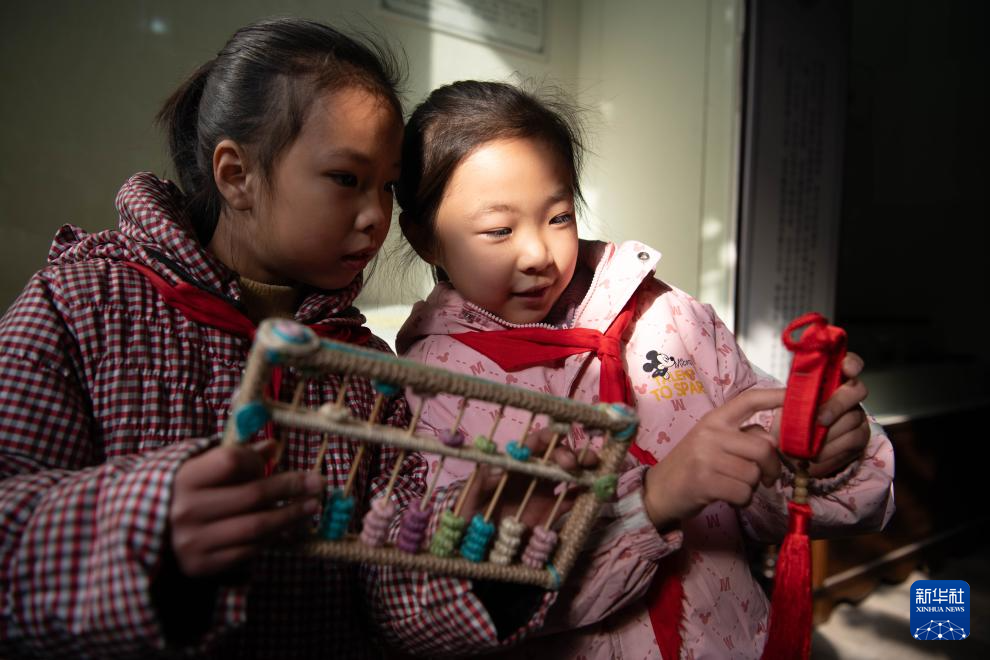 1月9日,在位于安徽省黄山市屯溪区的程大位珠算博物馆,屯溪大位小学的学生展示手工制作的算盘。
