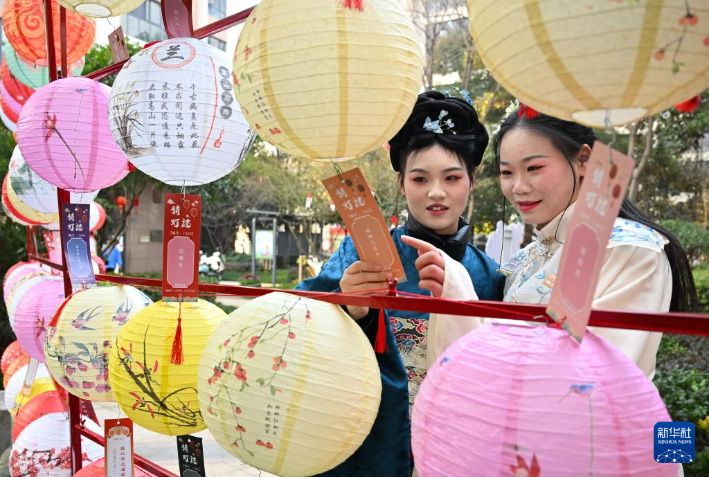 1月19日,身着汉服的居民在社区庙会上猜灯谜。