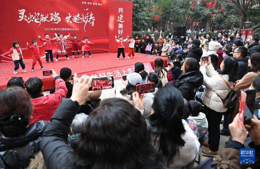 1月19日,居民在社区庙会上观看小朋友表演节目。