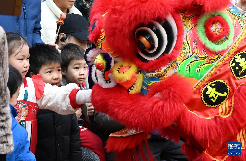 1月19日,小朋友在社区庙会上和舞狮互动。