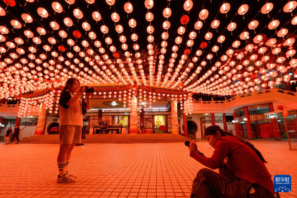 1月21日,在马来西亚吉隆坡天后宫,市民拍摄节日彩灯。